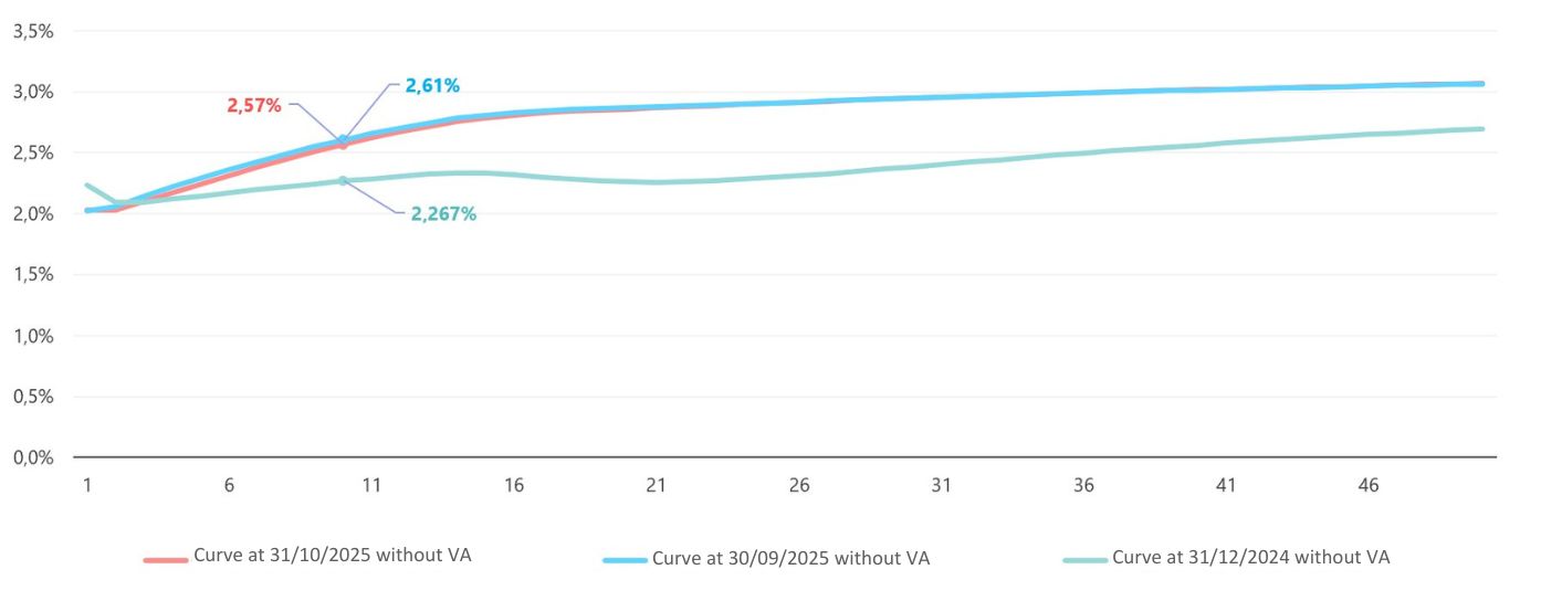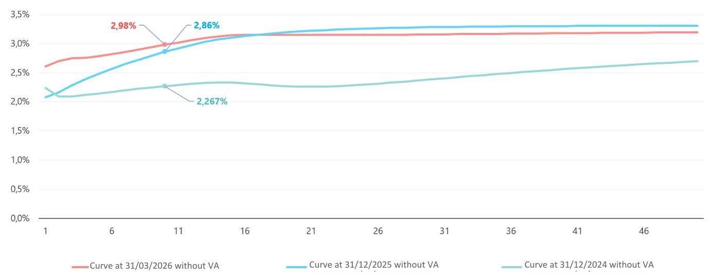 Every month, EIOPA constructs the risk-free yield curve from swap rates for maturities of 1 to 10 years, 12 years, 15 years and 20 years, from which a Credit Risk Adjustment (CRA) is deducted at a value of between 0.10% and 0.35%: