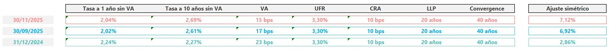 A continuación, se procede al ajuste de volatilidad, incorporandolo al tipo de cada vencimiento que sea inferior al LLP (traslación de la curva), y luego los tipos de los vencimientos siguientes se obtienen por extrapolación al UFR (método Smith Wilson).