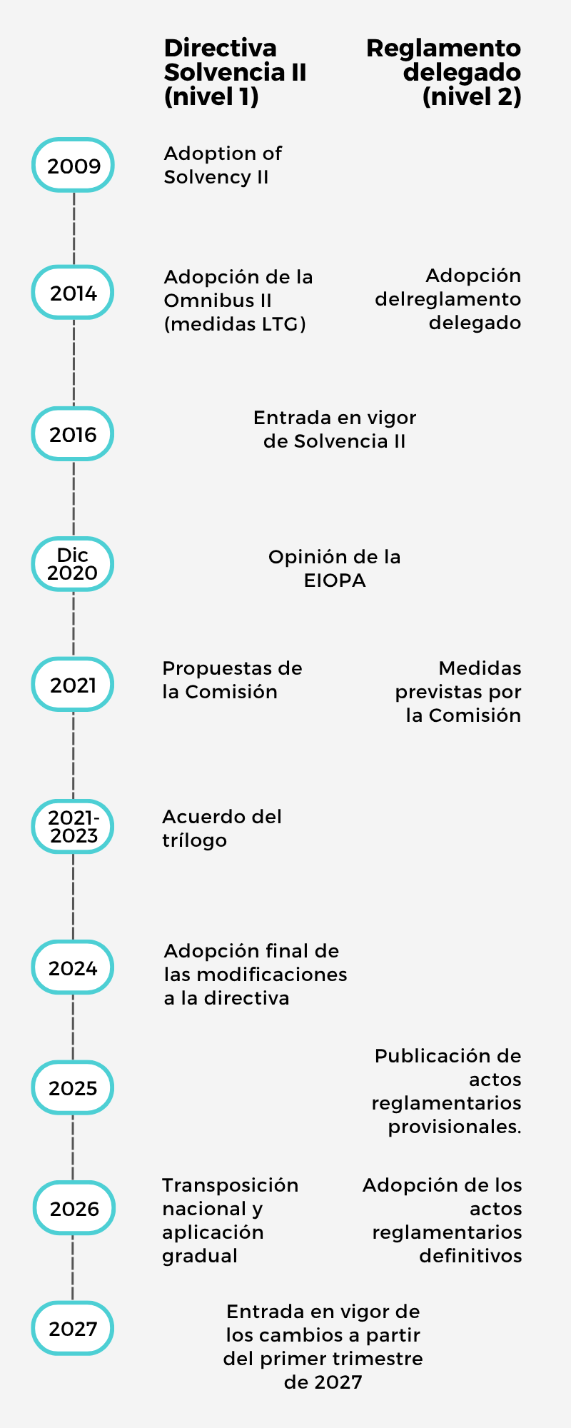 En diciembre de 2023, las negociaciones en trílogo entre el Parlamento Europeo, la Comisión y el Consejo alcanzaron un acuerdo sobre la revisión de Solvencia II, lo que permitió la adopción de las enmiendas de Nivel 1 (la Directiva). Posteriormente, en julio de 2025, la Comisión Europea publicó los proyectos de enmienda de Nivel 2 (actos delegados), que aportan los detalles técnicos de la Directiva.