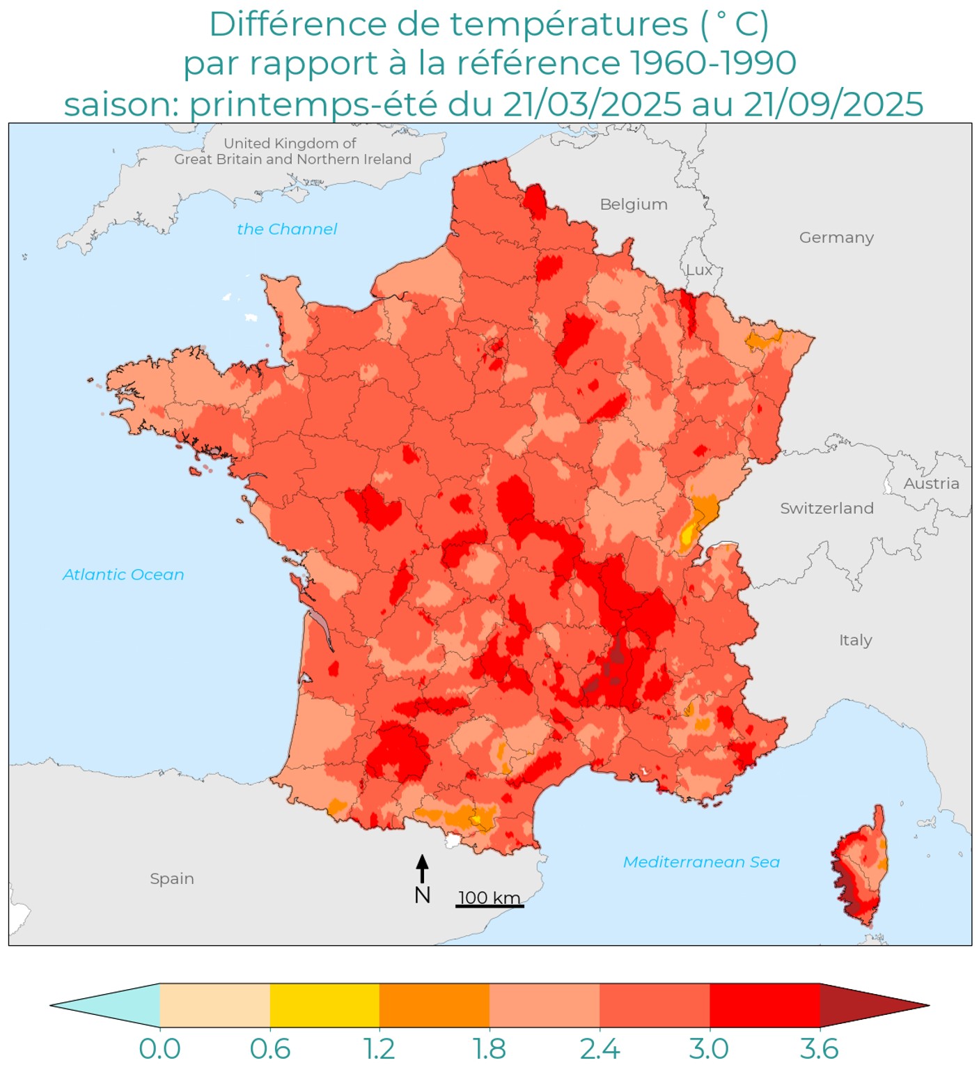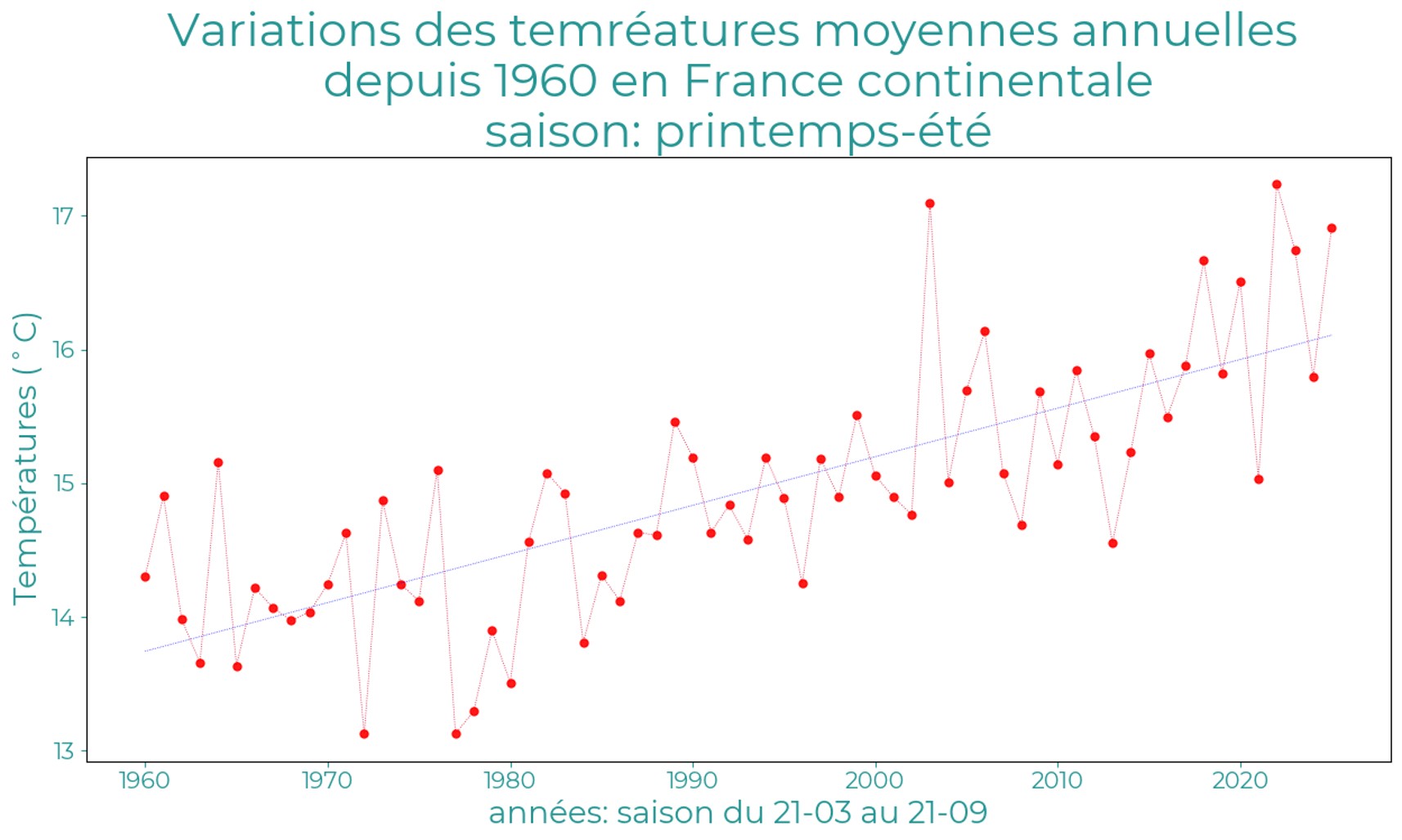L’évolution des températures moyennes nationales saisonnières montrent une augmentation supérieure à 1°C entre 1960 et 2025 et la saison printemps-été 2025 s’inscrit dans une succession d’années très chaudes telles que 2022 et 2023.